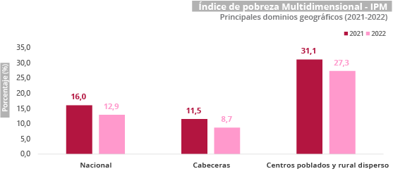 La información añadió que la disminución de la incidencia de la pobreza multidimensional en las cabeceras del país fue de 2,8 puntos porcentuales, pasando del 11,5% en 2021 al 8,7% en 2022.