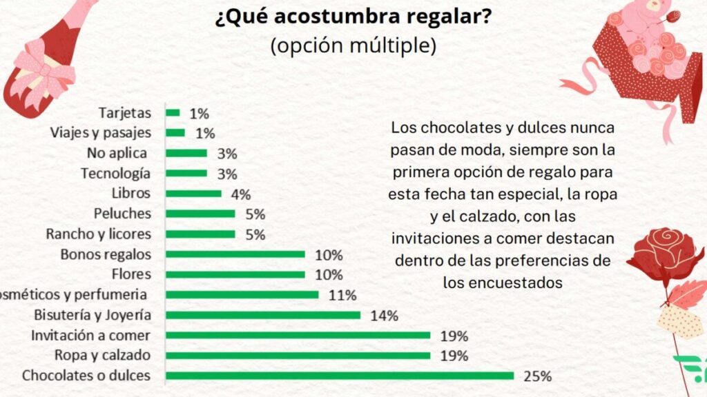En cuanto al tipo de regalos, los dulces y chocolates siguen siendo el obsequio ideal, sobre todo para los enamorados, así lo indicó el 25% de los encuestados. Por su parte, el segmento de prendas de vestir y las invitaciones a comer se disputan, con el 19% respectivamente, el segundo lugar del top de regalos