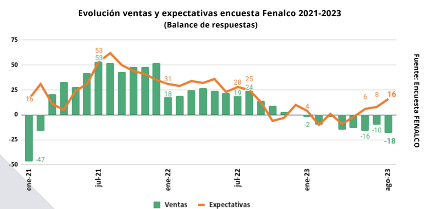 El presidente de Fenalco, Jaime Alberto Cabal, señaló que se completan ocho meses de retroceso en las ventas, y que en agosto los hogares fueron muy cautelosos con sus gastos, en particular con las adquisiciones de bienes de consumo durable como aparatos electrónicos, vehículos y remodelación del hogar, comportamiento comprensible por el alto costo del crédito.