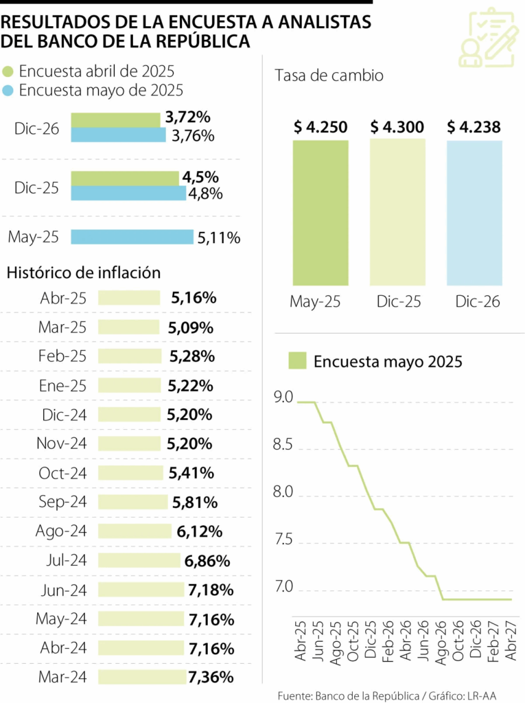 Para mayo de 2025, la Encuesta Mensual de Expectativas de Analistas Económicos del Banco de la República, señaló que los analistas ajustaron la proyección de la inflación para final de 2025. En la encuesta del mes pasado la proyección era de 4,5%, mientras que en la de mayo señalaron que el dato se ubicaría en 4,8%, cifra que no se ve desde noviembre de 2021.