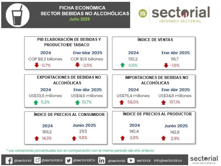 El primer semestre de 2025 para el sector de bebidas un escenario de dos caras. En el ámbito nacional, la demanda se vio contraída, con una caída en el volumen de ventas del 4,3% por factores climáticos. También hubo una fuerte presión sobre el bolsillo del consumidor, cuyo IPC sectorial alcanzó el 11,8% a junio. Este incremento de precios no se explica por los costos de producción que se mantuvieron estables. Más bien, se debe al efecto del impuesto que ha modificado los patrones de compra. En agudo contraste, el comercio exterior vivió una expansión sin precedentes.