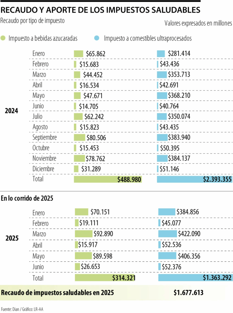 Mientras que entre enero y junio del año pasado se habían recaudado $1,33 billones ($1,13 billones del impuesto a comestibles ultra procesados y $204.906 millones del de bebidas azucaradas), en el primer semestre de 2025 ya se recogieron $1,67 billones ($1,36 billones del tributo a los comestibles ultra procesados y $314.321 millones por cuenta del de bebidas azucaradas).