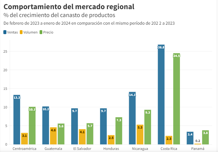 Guatemala y Nicaragua también experimentaron incrementos en el consumo, aunque moderados en comparación con el aumento de precios. En Guatemala, mientras los precios crecieron un 5,6%, el consumo solo aumentó un 4,6%. Mientras tanto, en Nicaragua, el consumo cerró con una variación del 5,3%, pero el costo de la compra aumentó un 9,3%.