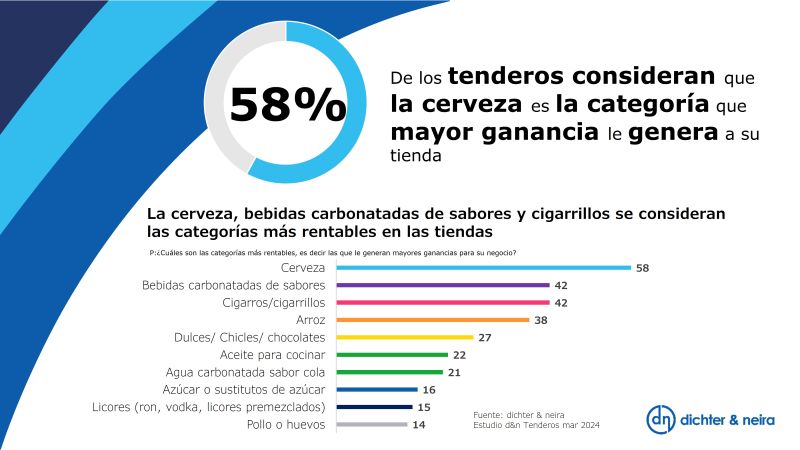 Para el 58% de los tenderos en Colombia, la categoría de cervezas es la que genera mayores ganancias, seguida por bebidas carbonatadas de sabores y cigarrillos, con un 42%. Luego sigue el arroz, con un 38%, los dulces, chicles y chocolates con un 27%, y cerrando el ranking, los aceites para cocinar, con un 22%.