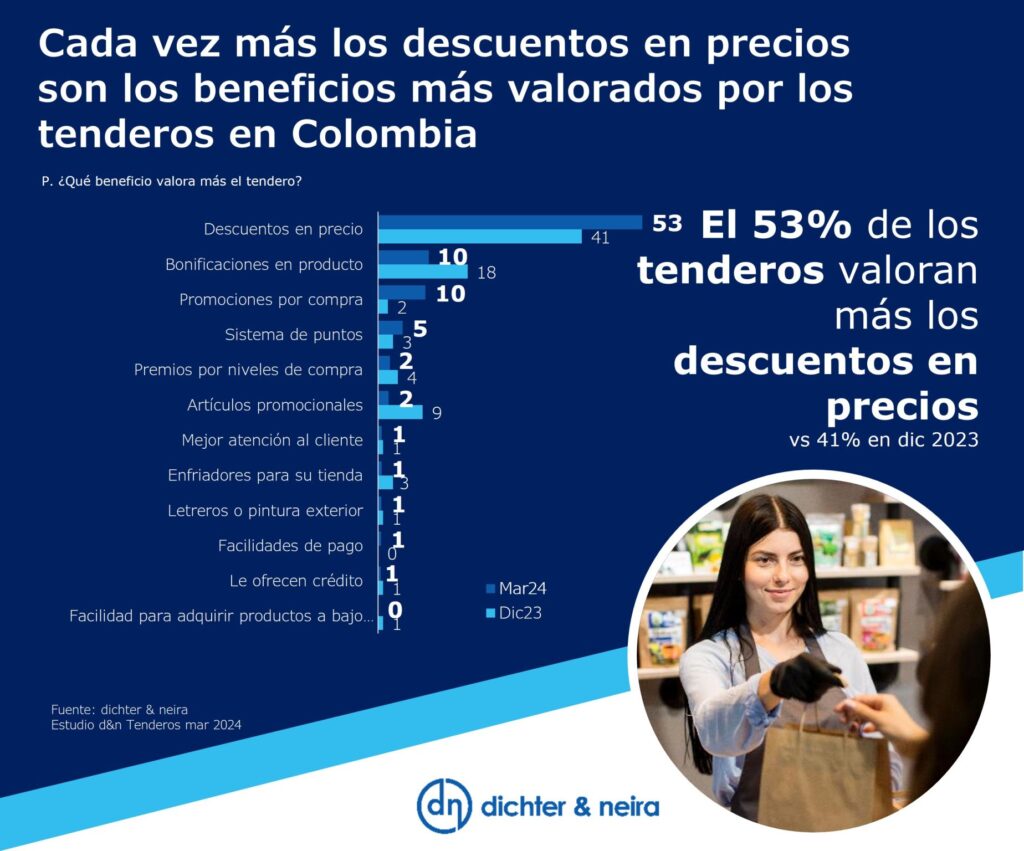En cuanto a preferencias, el 53% de los tenderos menciona los descuentos como el beneficio más importante para sus consumidores, mientras que el 10% valora las bonificaciones en productos y promociones por compra. Para el 5% de los encuestados la preferencia es por un sistema de puntos como beneficio.