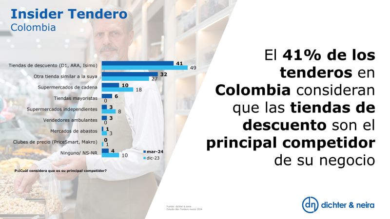 Se revelaron los resultados del estudios Insider Tendero y el más reciente Índice de Confianza del Tendero (ICT), realizado por la firma Dichter & Neira, en donde se destaca que el 41% de los tenderos cree que las tiendas de descuento (o hard discount) son su mayor competencia. En la medición pasada este dato se ubicaba en un 49%, representando una disminución de ocho puntos porcentuales.