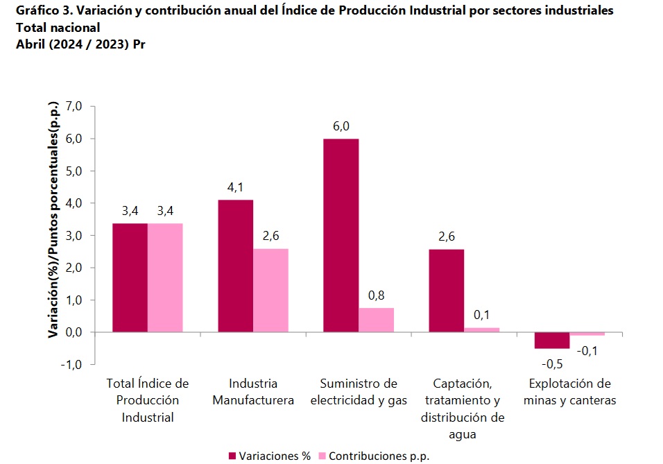 “En abril de 2024 frente a abril de 2023, los sectores que presentaron variaciones positivas fueron: industria manufacturera con una variación de 4,1%; suministro de electricidad y gas de 6,0%; captación, tratamiento y distribución de agua de 2,6%”, informó el Dane en un boletín.